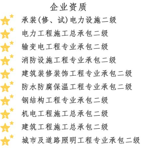 金楓電力集團(tuán)有限公司,成立于2015年5月28日,注冊資金6060萬元,是一家專業(yè)從事電力工程施工的集團(tuán)化公司。公司經(jīng)營范圍包括:電氣安裝服務(wù);建設(shè)工程施工;輸電、供電、受電電力設(shè)施的安裝、維修和試驗(yàn);測繪服務(wù);建筑勞務(wù)分包;建筑工程設(shè)計(jì);發(fā)電機(jī)及發(fā)電機(jī)組制造;建筑工程機(jī)械與設(shè)備租賃;工業(yè)工程設(shè)計(jì)服務(wù);技術(shù)服務(wù)、技術(shù)開發(fā)、技術(shù)咨詢、技術(shù)交流、技術(shù)轉(zhuǎn)讓、技術(shù)推廣等。公司持有國家能源局頒發(fā)的承裝(修、試)電力設(shè)施許可證,承裝類二級、承修類二級、承試類二級資質(zhì);電力工程施工總承包二級資質(zhì);輸變電工程專業(yè)承包二級資質(zhì);建筑裝修裝飾工程專業(yè)承包二級資質(zhì);消防設(shè)施工程專業(yè)承包二級資質(zhì);防水防腐保溫工程專業(yè)承包二級資質(zhì);施工勞務(wù)資質(zhì);機(jī)電工程施工總承包二級;建筑工程施工總承包二級;城市及道路照明工程專業(yè)承包二級;鋼結(jié)構(gòu)工程專業(yè)承包二級資質(zhì);公司已通過質(zhì)量管理體系認(rèn)證、環(huán)境管理體系認(rèn)證及職業(yè)健康安全管理體系認(rèn)證。并獲得省級信用評價(jià)AAA證書;連續(xù)多年納稅信用評價(jià)A級。